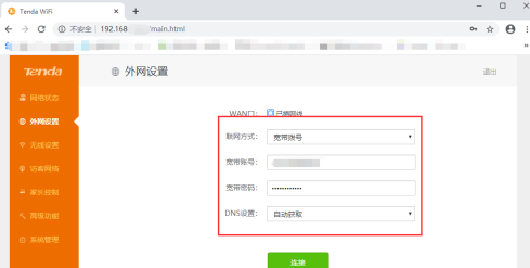 4)选择联网方式为“宽带拨号”,接着输入宽带账号和密码,点击连接